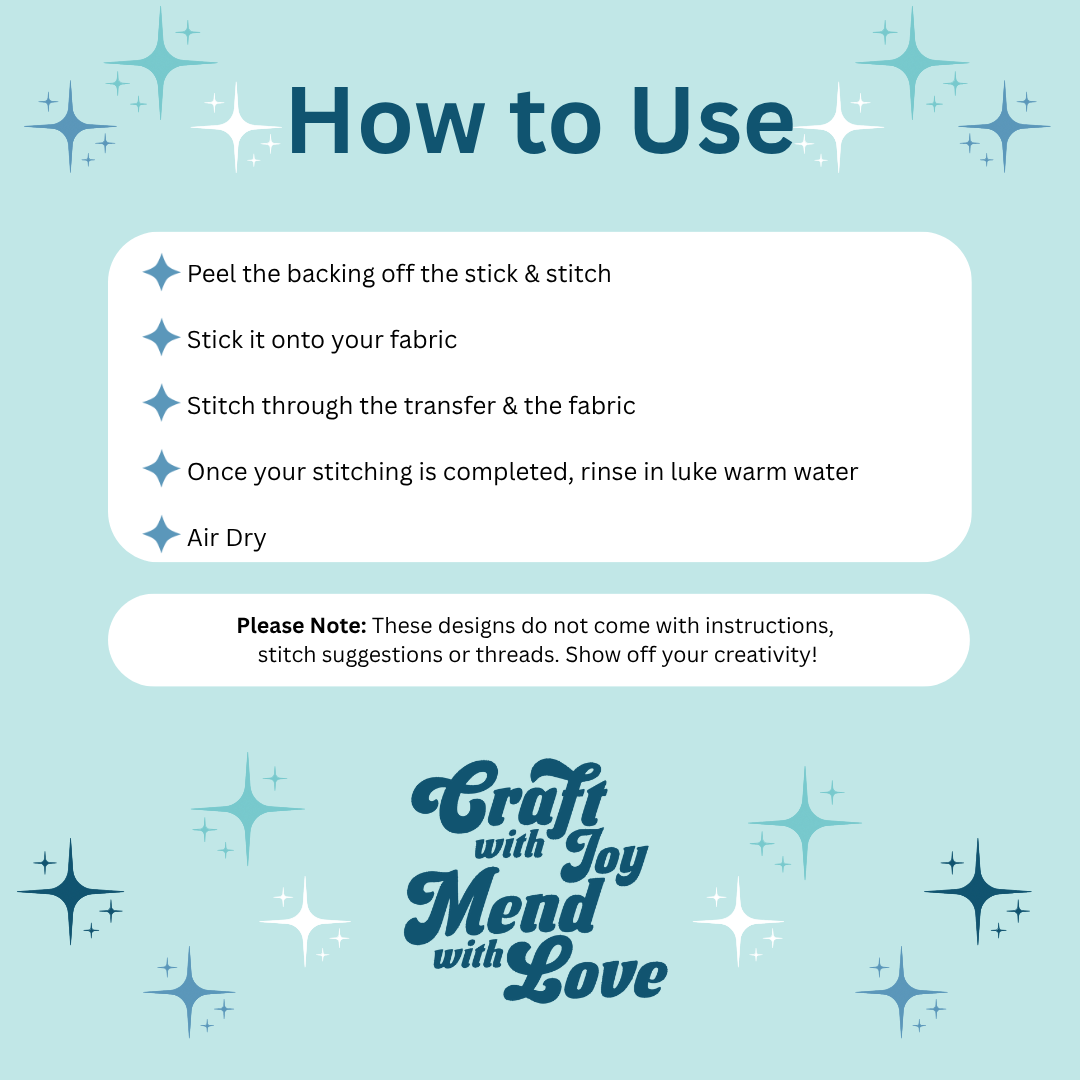 These water solvable transfers are great for embellishing clothing, bags or other fabric items; they could also be used as part of a visible mend. A simple solution to getting a beautiful design for yourself, and easy to decorate any fabrics. Simply peel off the backing, stick it onto your fabric, sew over it, and rinse off with warm water.