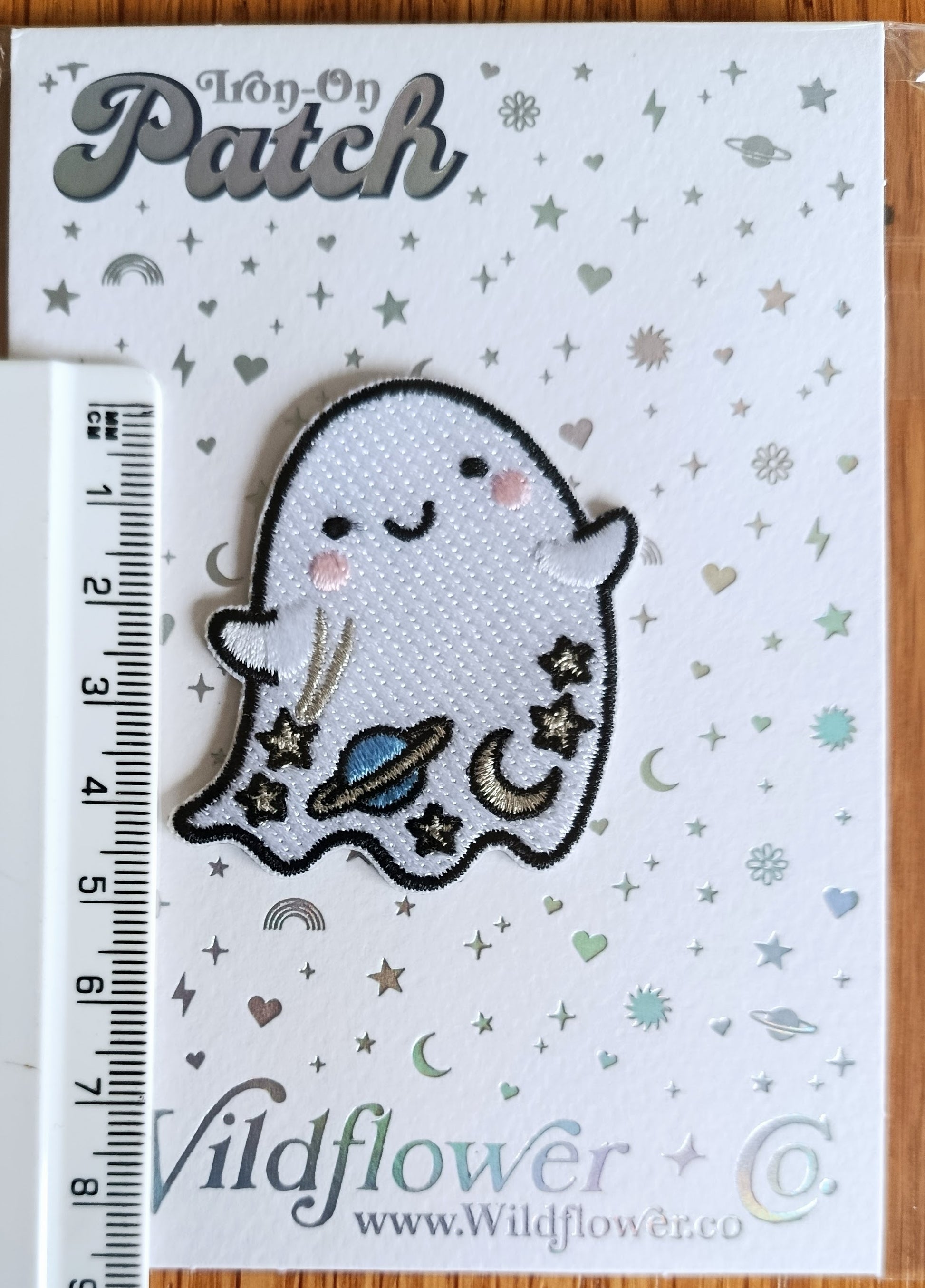 Iron on embroidery patch of a ghost with space details! Packaged on cute holographic, signature patch cards with instructions & protective sleeves. Intended for use by adults only, colours may appear different across different screens.
