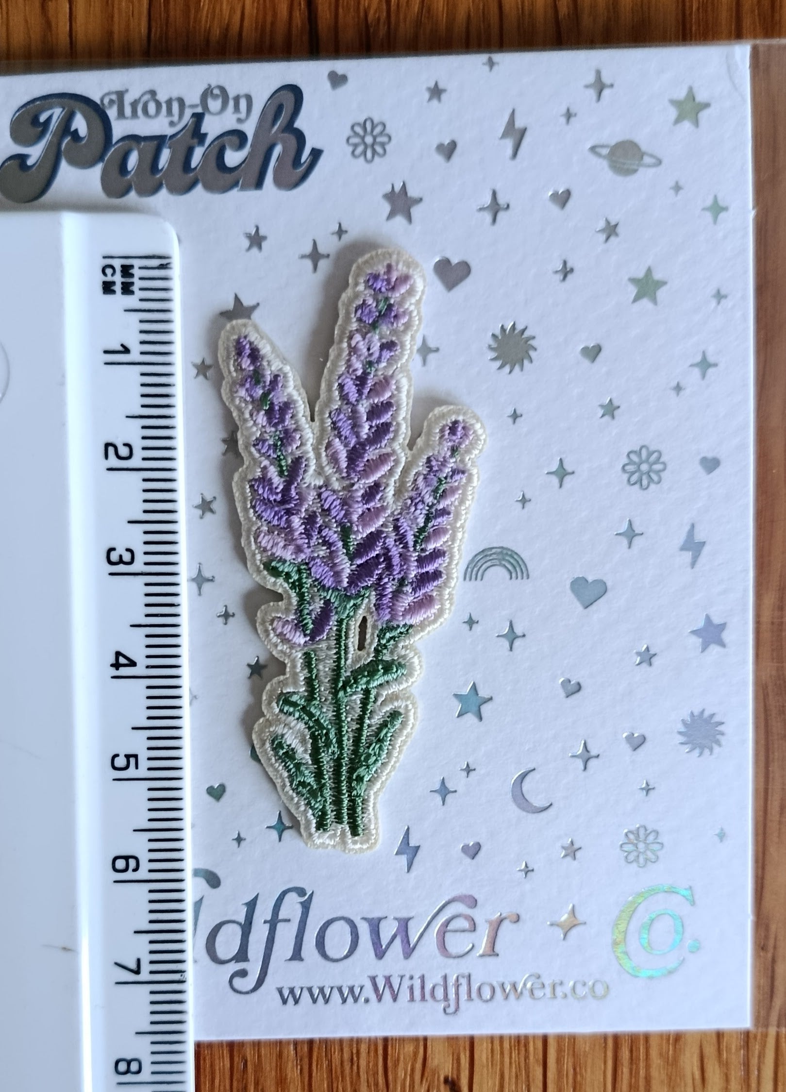 Iron on embroidery patch of lavender flowers! Packaged on cute holographic, signature patch cards with instructions & protective sleeves. Intended for use by adults only, colours may appear different across different screens.