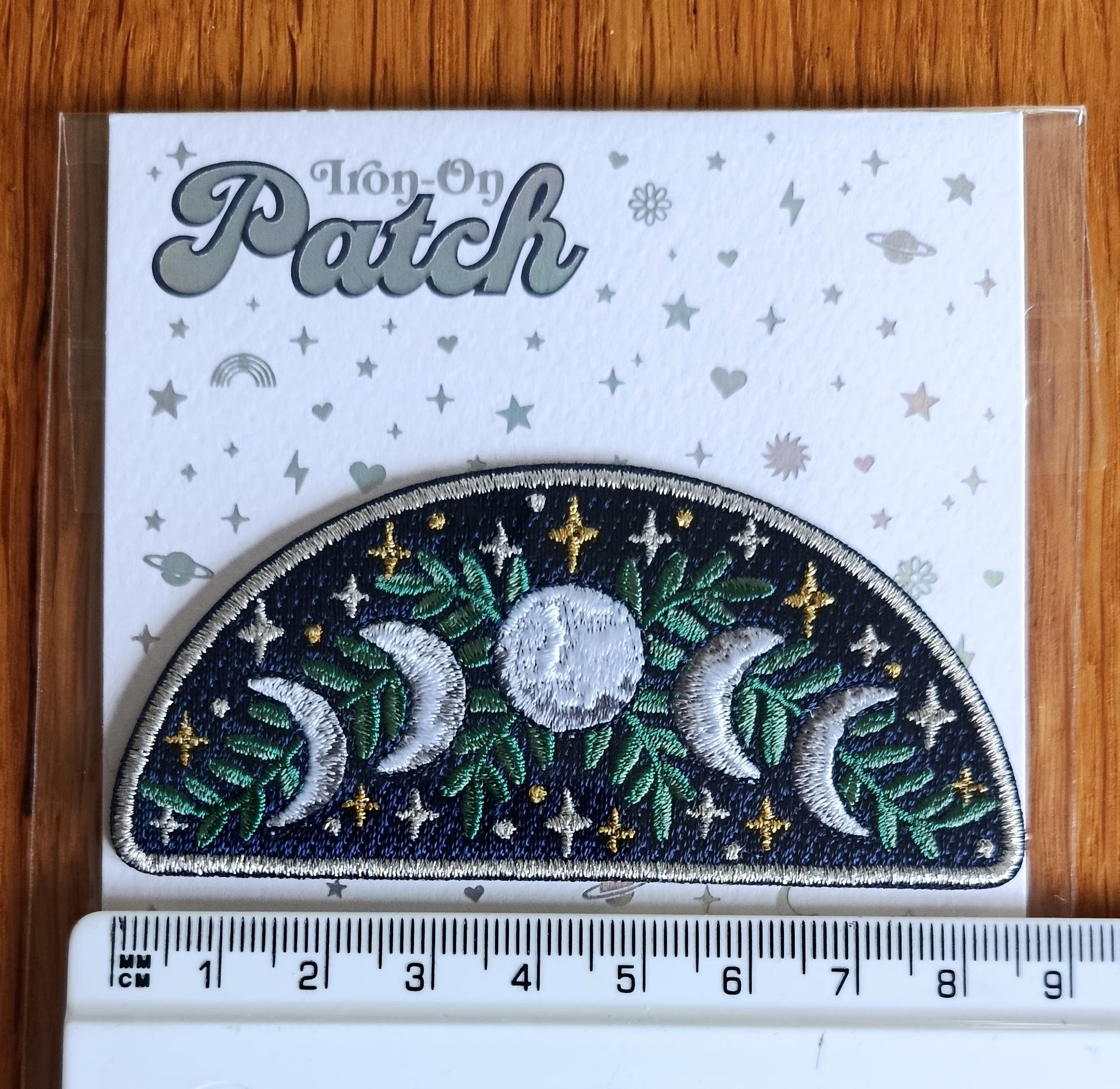 Iron on embroidery patch of the moon phases in a semi circular shape! Packaged on cute holographic, signature patch cards with instructions & protective sleeves. Intended for use by adults only, colours may appear different across different screens.